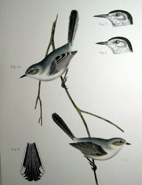 1850s Hand Colored Stone Lithographs of Birds of the West Black-tailed Gnatcatcher This 1859 stone lithograph is of a pair of Black-tailed Gnatcatchers with close-ups of the heads and tail feathers. These birds, as their name suggests, feed on pesky little bugs in the desert. In the upper margin it says "U. S. P. R. R. Exp. & Surveys --- 35th Parallel" and "Birds. --- Plate XXXIII." Apparently the 35th parallel survey was the first to ever come upon these little birds and describe them and these lithographs are the first publication of illustrations of these birds! The description of the bird in the reports, attached to the back of the backing board, says the bird was "First described from these specimens" and notes they were found along the Little Colorado River and again along the head waters of Bill Williams' Fork. It comes matted in the same manner as the other birds in this series. Price: SOLD