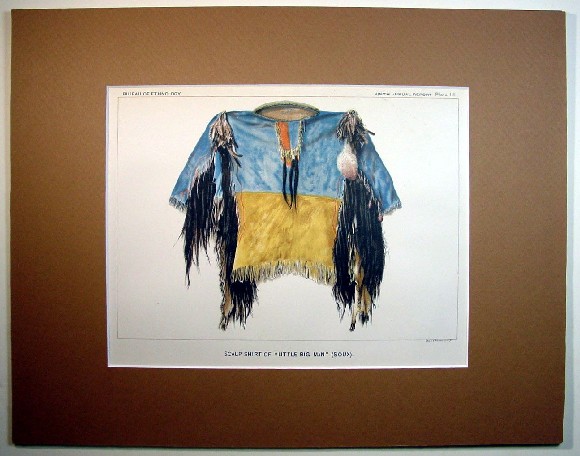 The slightly out of focus picture above (a clearer view of it matted is below) shows the scalp shirt of the great chief of the Lakota Sioux, Crazy Horse, who was instrumental in the demise of General George A. Custer at the famous battle of Little Bighorn. Captain Burke, as noted below in the text description, acquired the relic from the Oglala Sioux warrior Little Big Man, who was with Crazy Horse when he died. The colorful print as shown below is matted to fit in a standard sized 11 x 14 inch frame and is enclosed in a protective plastic sleeve.