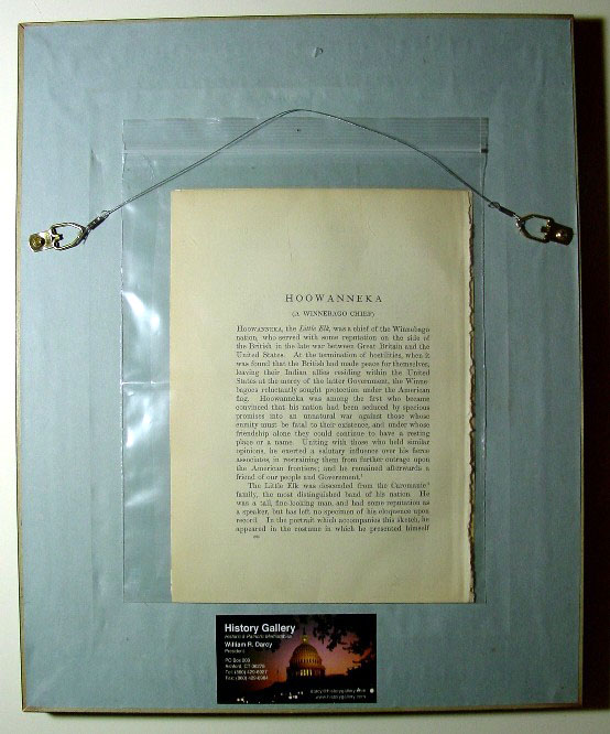 This is one of our favorite Indian prints showing a colorful and strong man in full dress regalia that is nicely matted and framed in complementary colors. It also comes with the full biography of HOOWANNEKA from "The Indian Tribes of North America" as shown below.