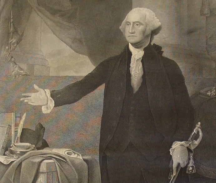 I have had a number Washington engravings done in the middle 1800s based on this Gilbert Stuart painting and each makes a few adjustments in the engraving process. Below is a close-up of Washington's face and hands from the Pelton engraving (with a little digital photo blues and reds added that are not in the print).