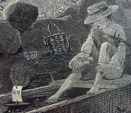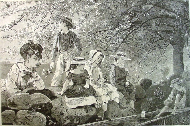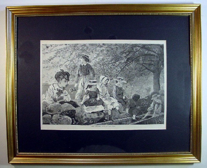 Winslow Homer Matted and Framed Wood Engraving "SPRING BLOSSOMS" This is one Winslow Homer's bucolic farm scenes centered around a stone wall and a blossoming apple tree over a mother and her five children. Many times Homer would sign his engravings in whimsical locations to add interest and here he signs "W. H." on the sail of the boys little boat, as shown below. Below is the print as matted and framed. The print is in very nice condition and comes with hanging hardware so it is ready for mounting on your wall or that of a valued friend or relative. The Old Print Shop lists this one unmatted at $350, but our lower overhead allows a more modest price for one that is both matted and framed. Price: SOLD