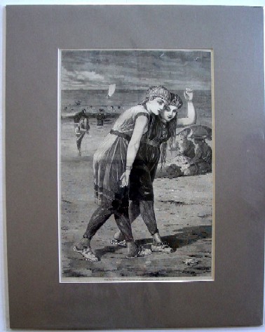 This 1873 classic by Winslow Homer has two young bathing beauties in step. The engraving is in excellent condition with full borders (show below in a scan) and without tears or discoloration. As usual, the pictures do not give the engraving full justice.