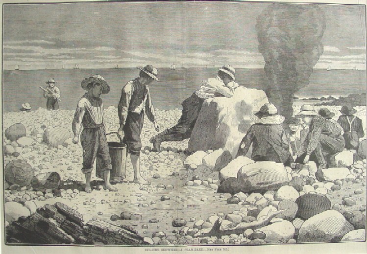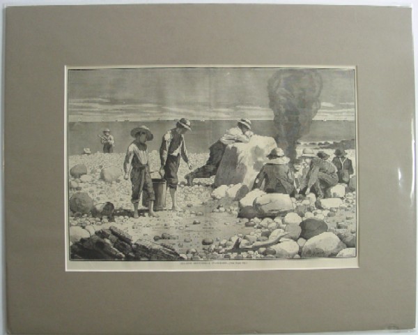 1873 Winslow Homer Wood Engraving "Sea-Side Sketches - A Clam-Bake" This is another of Winslow Homer's great seaside engravings from when he stayed in Gloucester, Massachusetts in the summer of 1873. Carefree boys in 1873 were apparently not tethered to the leash of their parents and were free to make their own amusement and lunch. Philip Beam in his book on Homer's wood engravings notes that,