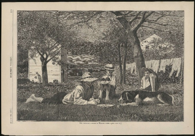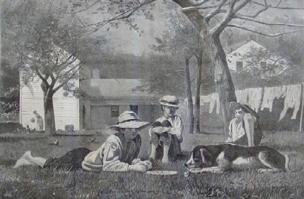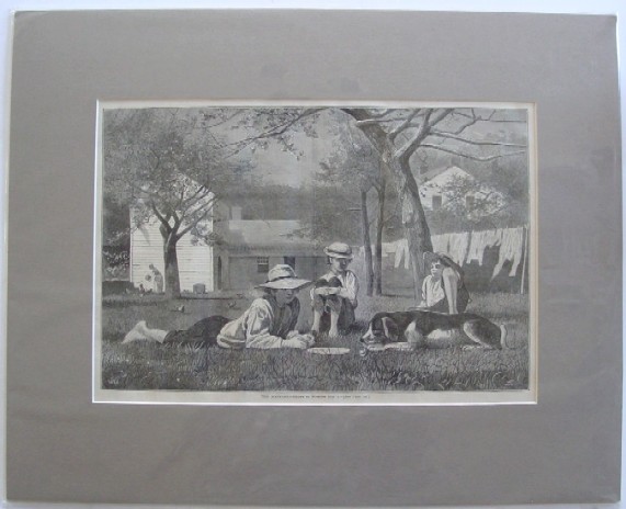 Winslow Homer Matted Wood Engraving "The Nooning" This is another one of Winslow Homer's genre classics of three boys relaxing with their dog in the backyard on a beautiful summer's day. Philip Beam in his book on Homer's periodical engravings noted that