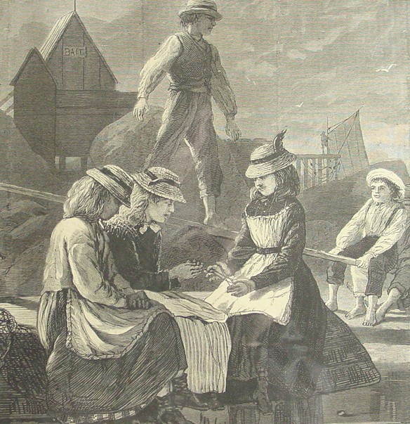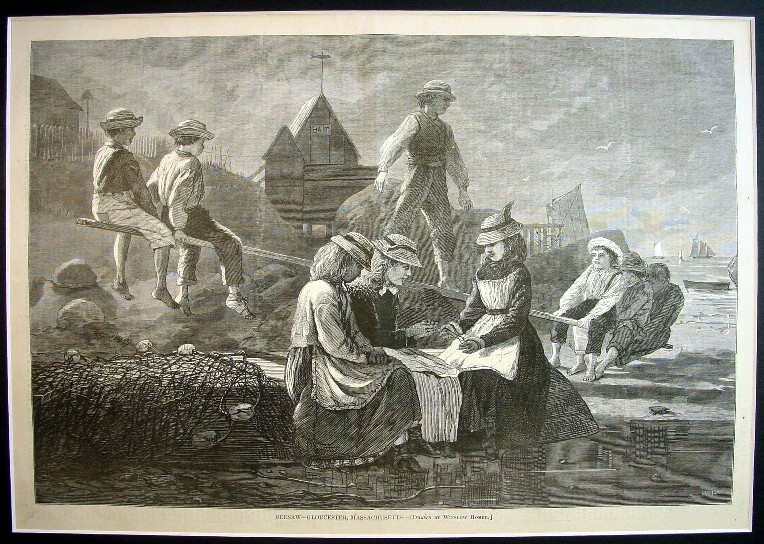 This classic Winslow Homer was done at the apex of his artistry in engraving from the famous Gloucester series of engravings. The author of "Winslow Homer's Magazine Engravings," Philip C. Beam, notes that prior to his move to Prout's Neck, Maine "an accent on carefree youth had always been prominent in Homer's work and he brought it to a climax in the mid-seventies with his 'children's series.' The best known of these are also masterpieces of his work in the engraving field" and Beam includes in this category the print offered here, "the SeeSaw-Gloucester." Below is a close-up of this fine print.