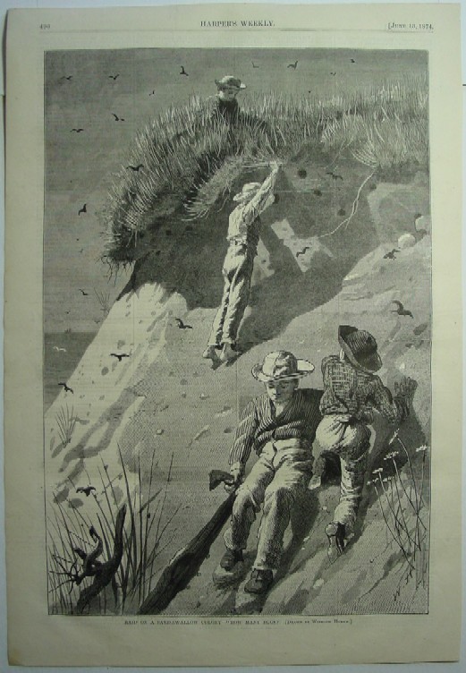 Winslow Homer Matted Wood Engraving "Raid on a Sand-Swallow Colony-How Many Eggs?" One of the "masterpieces of his work in the engraving field" This is one of Winslow Homer's classic wood engravings in excellent condition. Philip Beam in his book on Homer's wood engravings notes that,