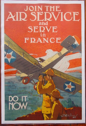 biplane shown with its pilot in an open air cockpit and two spotters, one