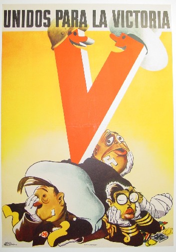 Mussolini and the Hideki Tojo with a big V sticking in their back and the